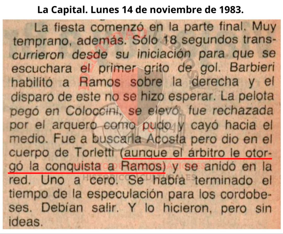 (*) En un revisionismo histórico de gran calidad en el año 2015, se identificó un posible gol en contra del 13/11/1983 ante Racing de Cba en el partido disputado en la fecha 29 del Metro 1983 lo que llevaría a 103 los goles de Victor Ramos. De acuerdo a las diversas crónicas, es posible que el remate de Ramos se haya desviado en un jugador rival antes de llegar al arco y el arquero la rechazó como pudo, enviándo la pelota al medio del area para luego pegar en el cuerpo de Torletti y meterse en el arco. Pero también hay crónicas y relatos del público presente en el estadio, que advierten que la pelota pudo haber traspasado la linea de cal antes que el arquero la despeje con los puños, ya que el movimiento del portero fue hacia atrás. Por lo tanto, ante la duda, lo primero que uno se pregunta es que informó el Juez del partido Barraza. Pues bien, el árbitro del partido le dió el gol a Condorito Ramos y ante la falta de un registro fílmico, desde este medio partidario, consideramos que las crónicas parciales de la época no son material suficiente para modificar la decisión del árbitro 32 años más tarde y tampoco para cambiar un dato histórico e institucional tan arraigado y en desmedro de los 104 goles de nuestro máximo goleador histórico.